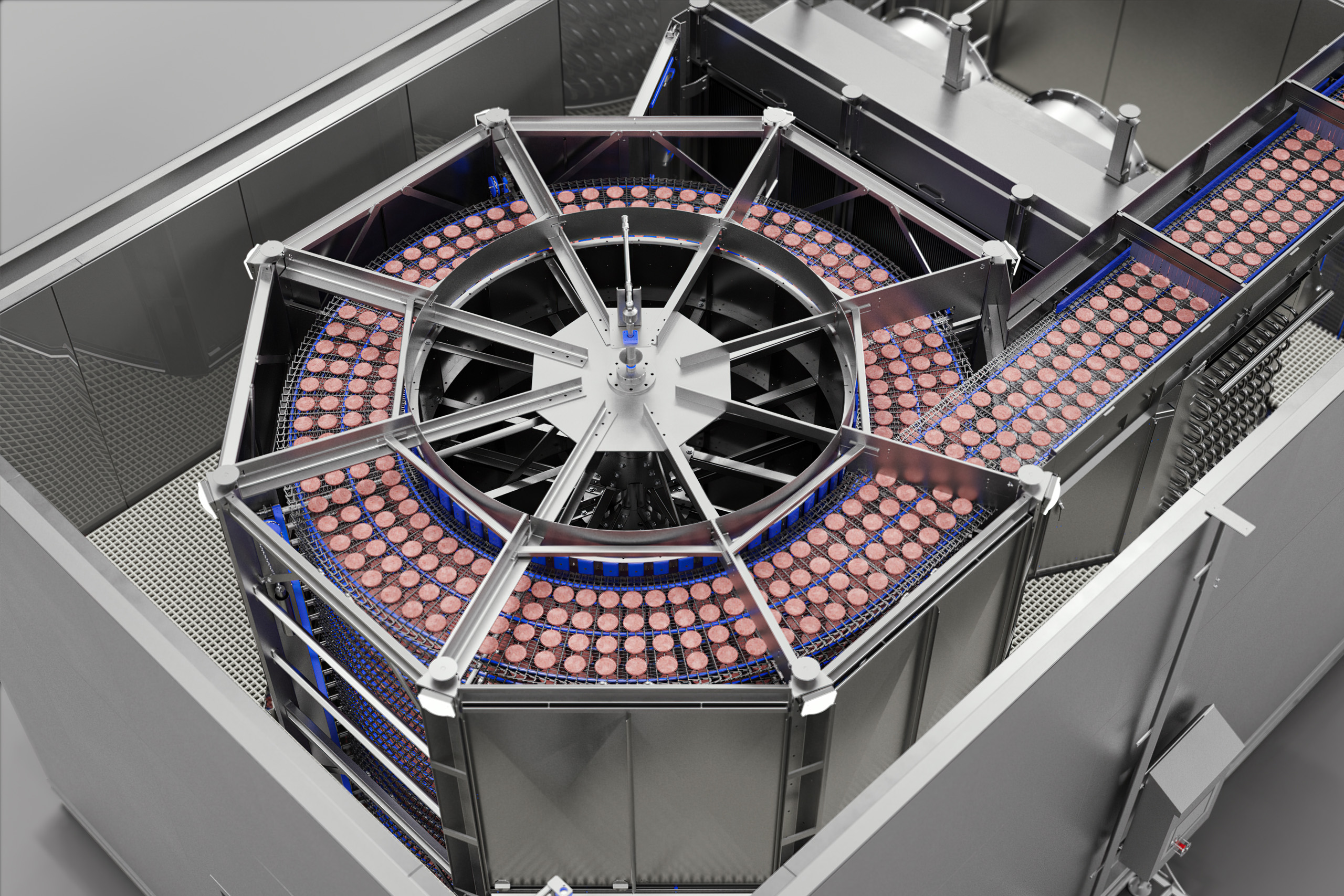 Die IQF-Spiraltechnologie zeichnet sich dadurch aus, dass Lebensmittel auf einem Förderband um eine rotierende Trommel transportiert werden, die sich horizontal dreht, während kalte Luft zirkuliert und über das Produkt geführt wird. Unser einzigartiger und effizienter Luftstrom bewirkt kürzere Gefrierzeiten, weniger Produktentwässerung sowie höhere Qualität und Ausbeute. Darüber hinaus können unsere Spiralen 144 Stunden lang heiß panierte und frittierte Produkte ohne Abtauen und sequentielles Auftauen behandeln. Dies minimiert das Bakterienwachstum und maximiert die Lebensmittelsicherheit.
