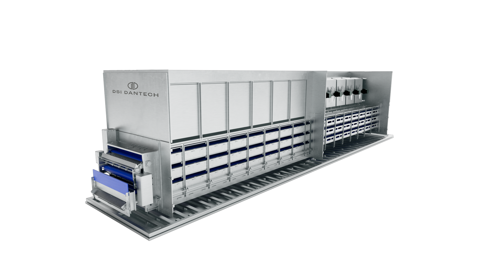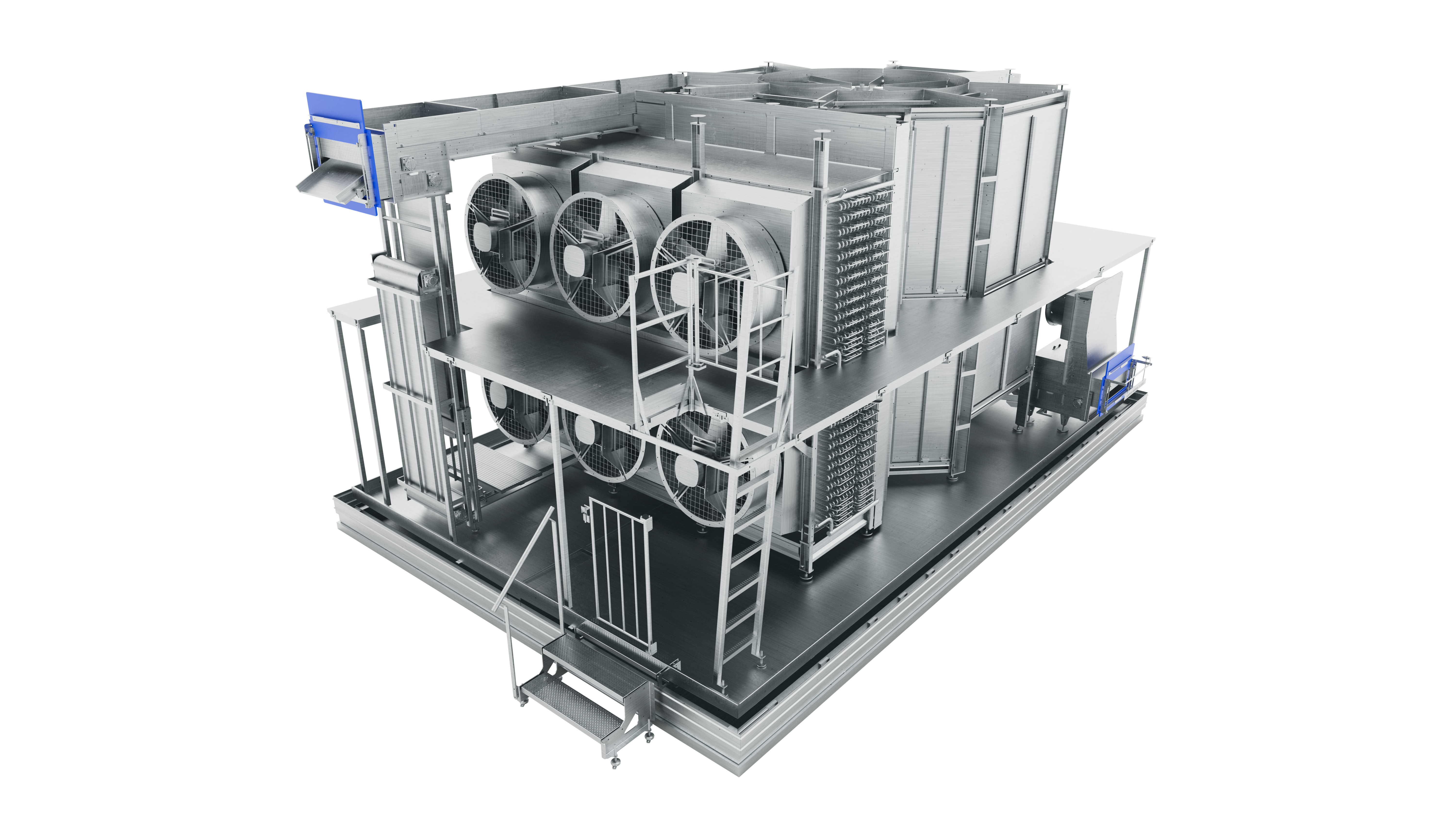 - Das Horizontal-flow®-Luftstromsystem sorgt für gleichmäßige Temperatur und Strömungsgeschwindigkeit über alle Ebenen – für schnelleres und konsistenteres IQF-Gefrieren.